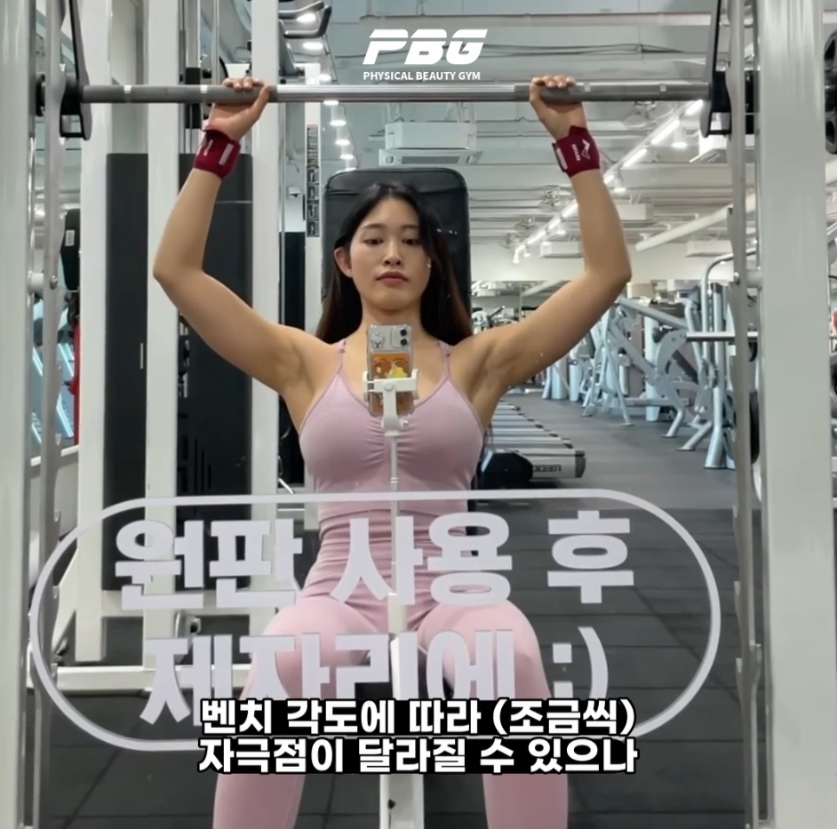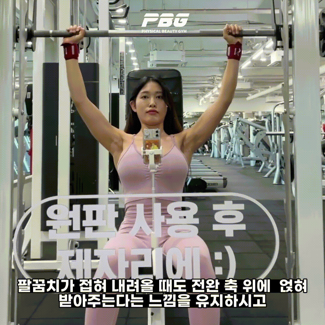 초보자 분들은 팔꿈치가 뒤로 빠지지 않도록 주의하며 15개에서 20개 사이의 횟수가 가능한 무게로 4세트 이상 연습해보시길 추천드립니다.